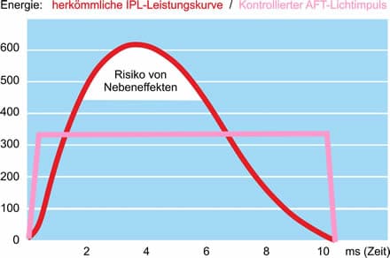 Alle unsere SLASER – Geräte sind mit der sogenannten „Square-Motivation-Technologie“ ausgestattet. Dieser Begriff setzt sich zusammen aus der Neuentwicklung einer rechteckigen Form (Square Pulse) des AFT Lichtimpulses und der Bewegung des Handstücks (Motion Operation) während der Behandlung. Dieser in der Amplitude begrenzte Energieimpuls verringert die Gefahr von Verbrennungen deutlich, diese Entwicklung ist auch der Grund für die Schmerzfreiheit der Behandlung. Das Schaubild vergleicht die Leistungskurve herkömmlicher IPL-Geräte und die AFT-Lichtimpuls Kurve unsere Geräte Generation von heute. Durch die „abgeschnittene“ Energiespitze ist eine absolut sichere und schmerzfreie Behandlung möglich. Die im Schaubild verglichenen Energiemengen sind die gleichen, aber die Verteilung ist jetzt mit der neuen Generation der IPL Geräte optimal geregelt.